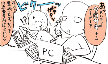 この間は、隣の席の人が電話に向かって「クロサギ」とか発するもんだから大いにうろたえました。たぶん、普段から冗談をいう人なので、黒崎さんのチームをシャレで「クロサギチーム」と呼んだのかもしれません。それか、単に私の耳が末期的で、聞き間違えたのかもしれません。どっちにしろ、心臓に悪いからやめてください。
